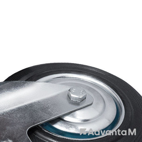 Промышленное поворотное колесо с тормозом имеет обод из оцинкованной стали и литую шинку из чёрной резины. Диаметр колеса 200 мм, высота колесной опоры с кронштейном 235 мм. Для крепления к оборудованию предусмотрен кронштейн с платформой размером 135x105 мм. Расстояние между центрами отверстий 105x75 мм. Грузоподъемность 185 кг. В оси роликовый подшипник, в поворотном узле – двухрядный шарикоподшипник с пластиковым пыльником.