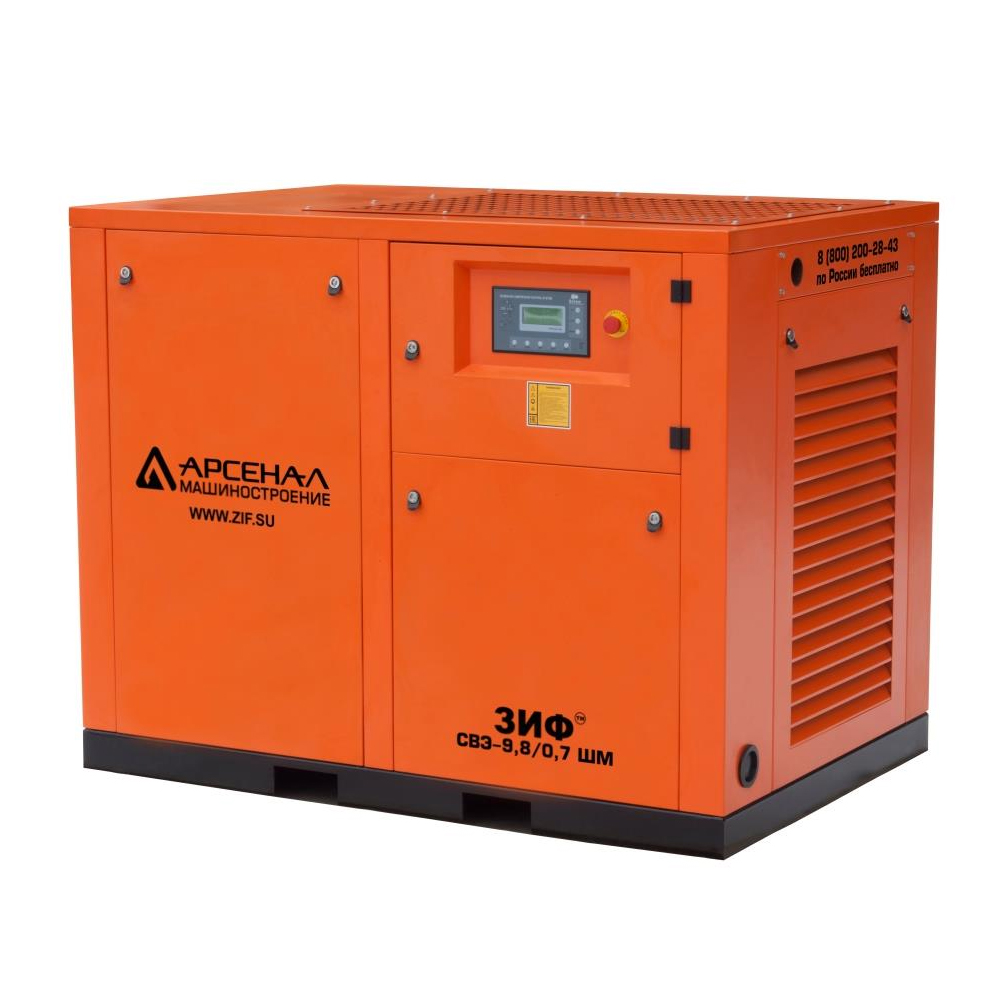 Винтовые электрические компрессорные установки ЗИФ-СВЭ серии ШМ (оснащены шумозащитным кожухом и микропроцессорным управлением) и ШМЧ (дополнительно установлен частотный преобразователь частоты вращения двигателя) служат для снабжения сжатым воздухом предприятий любого типа и размера.