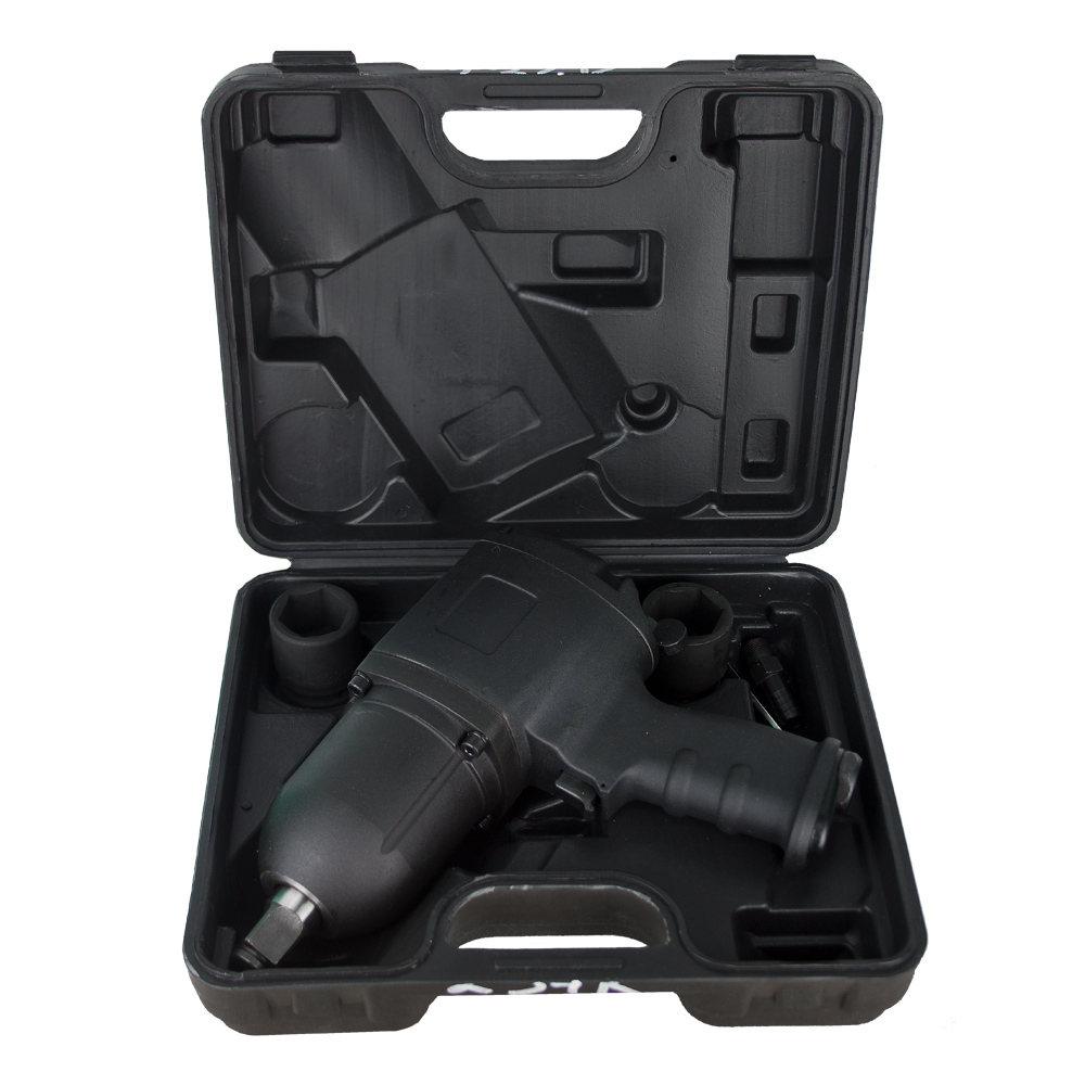 Пневмогайковерт реализуется в кейсе. Гайковерт укомплектован масленкой и двумя торцевыми головками с квадратом шпинделя 3/4 дюйма. Размер головок покупатель вправе выбрать на свое усмотрение, в стоимость комплекта входят любые две головки размером под ключ от 17 до 36 мм.
