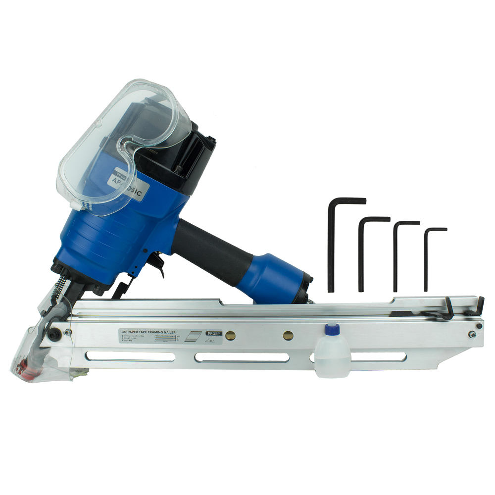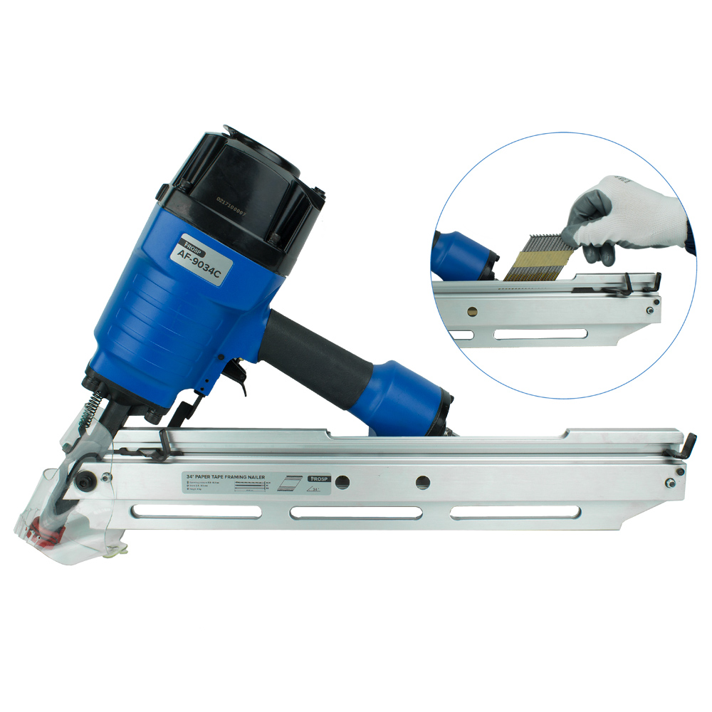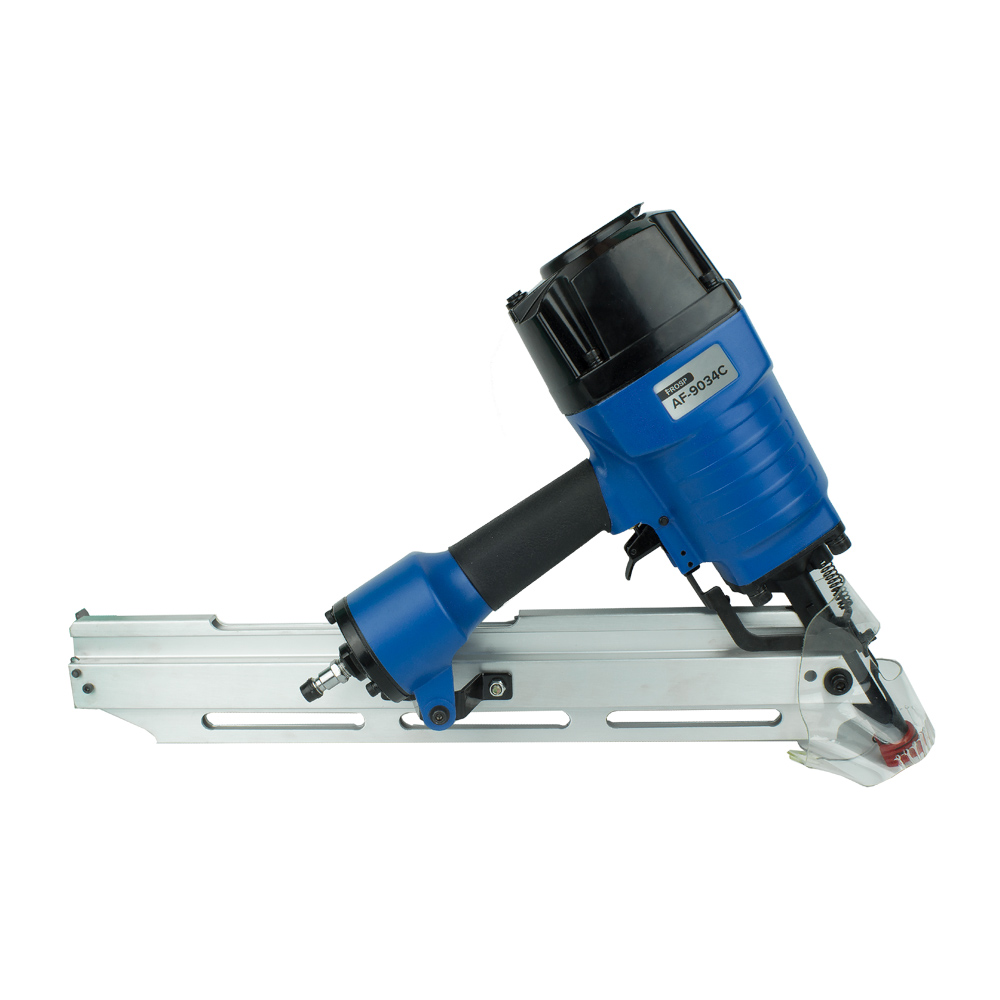 FROSP AF-9034C – реечный пневматический гвоздезабивной нейлер для гвоздей с D-образной шляпкой в бумажной обойме с углом наклона 34 градуса. Применяется для ремонта и изготовления деревянных конструкций. Например, каркасного строительства, изготовления мебели, забора, подиума и других конструкций. Бьёт крепеж длинной 50-90 мм, диаметром 2.87-3.33 мм с ёмкостью магазина 80 гвоздей.